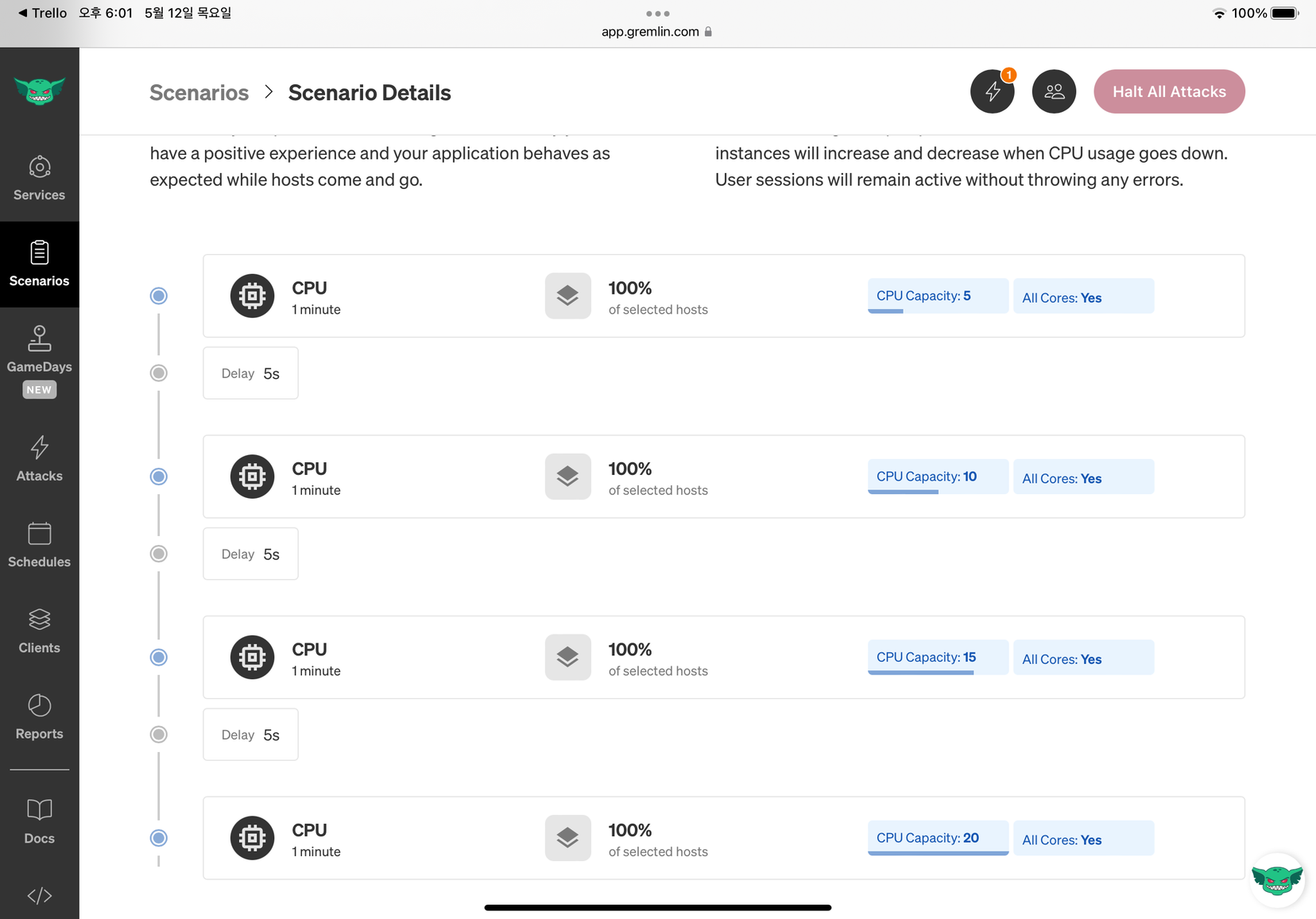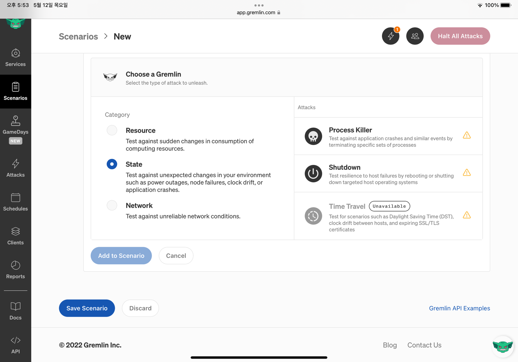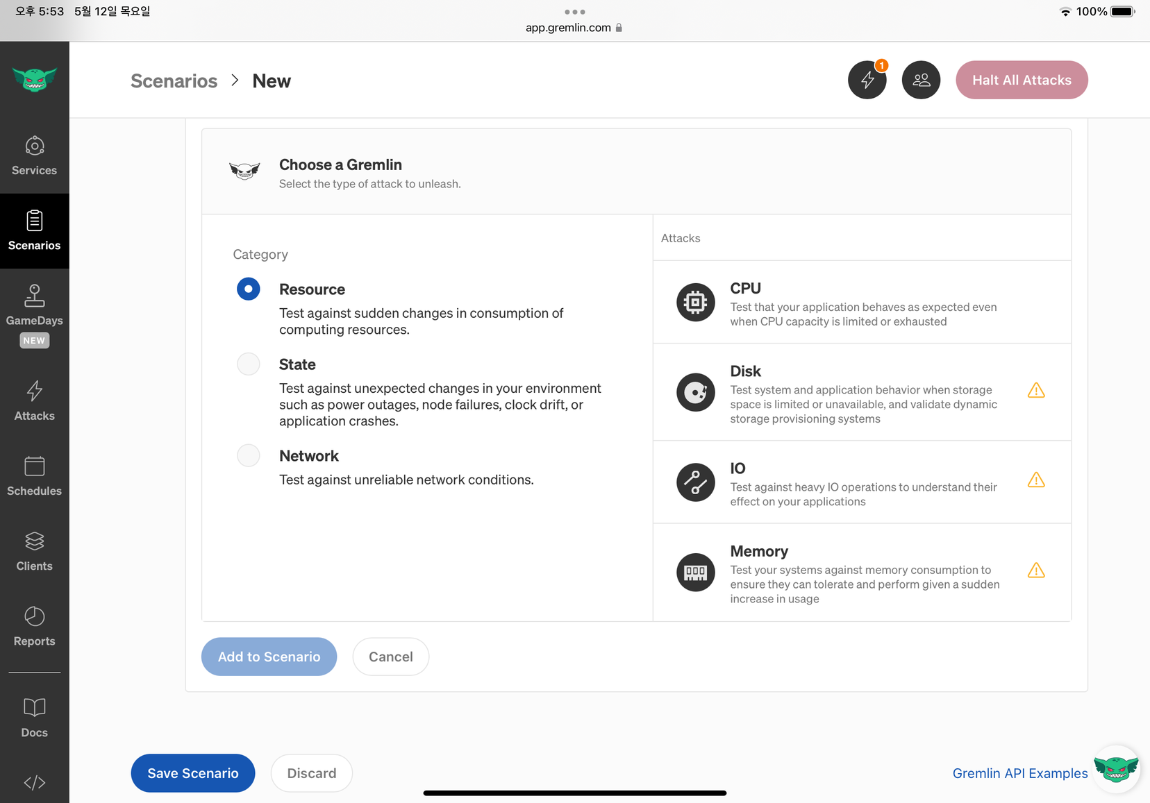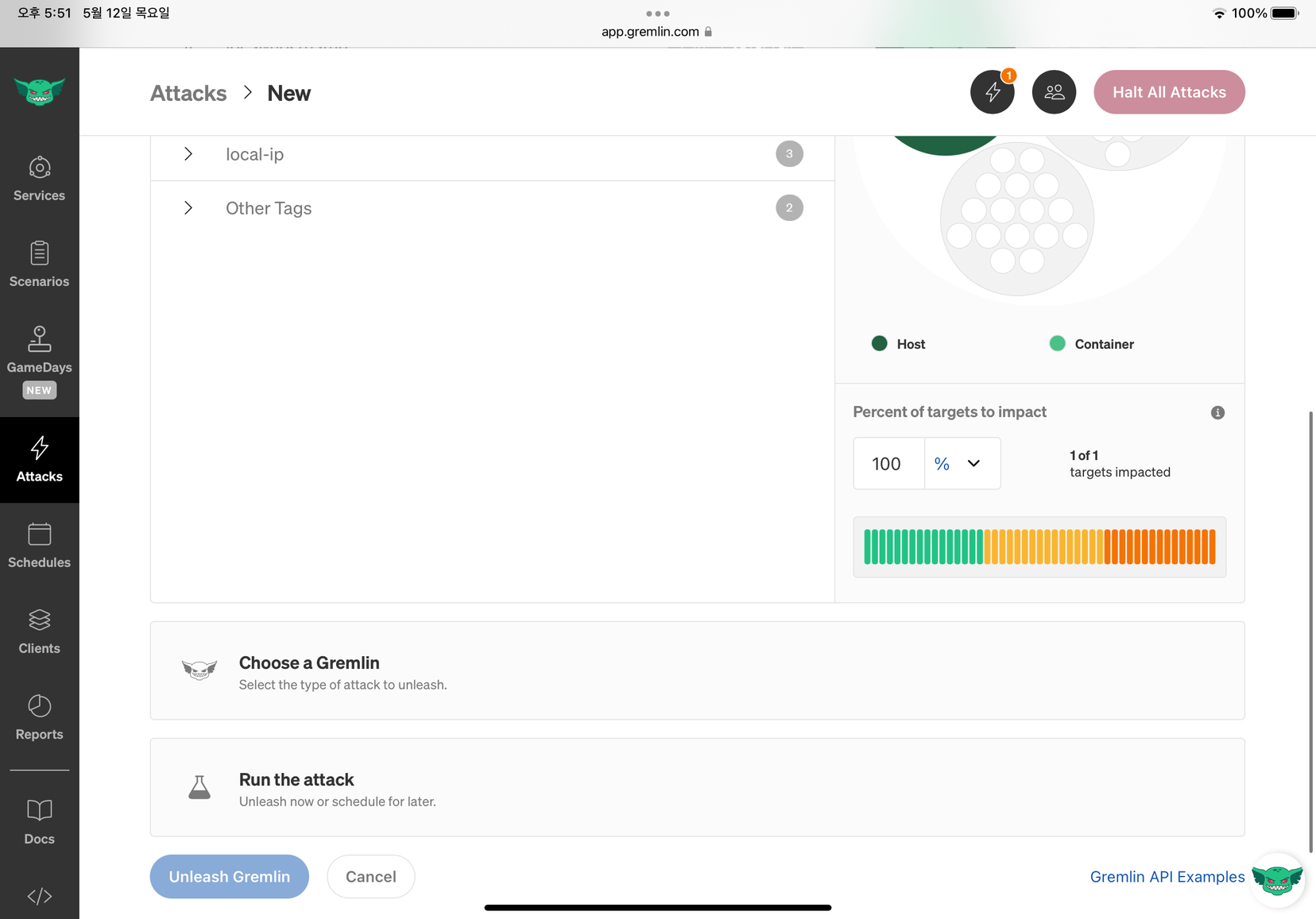 그렘린 client가 테스트 대상 인프라에 설치가 되고 Gremlin Control Plane가 인증이 되면, API, UI, Cli로 공격 테스트가 가능해 진다.
