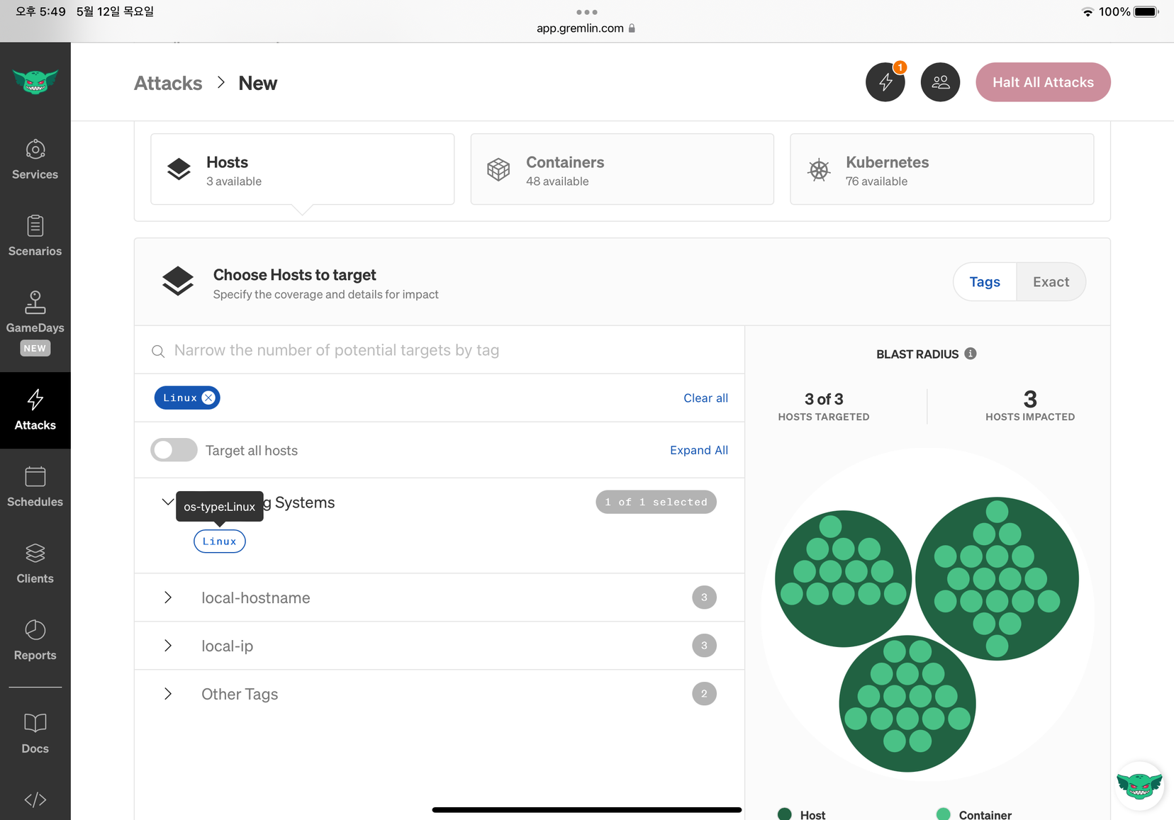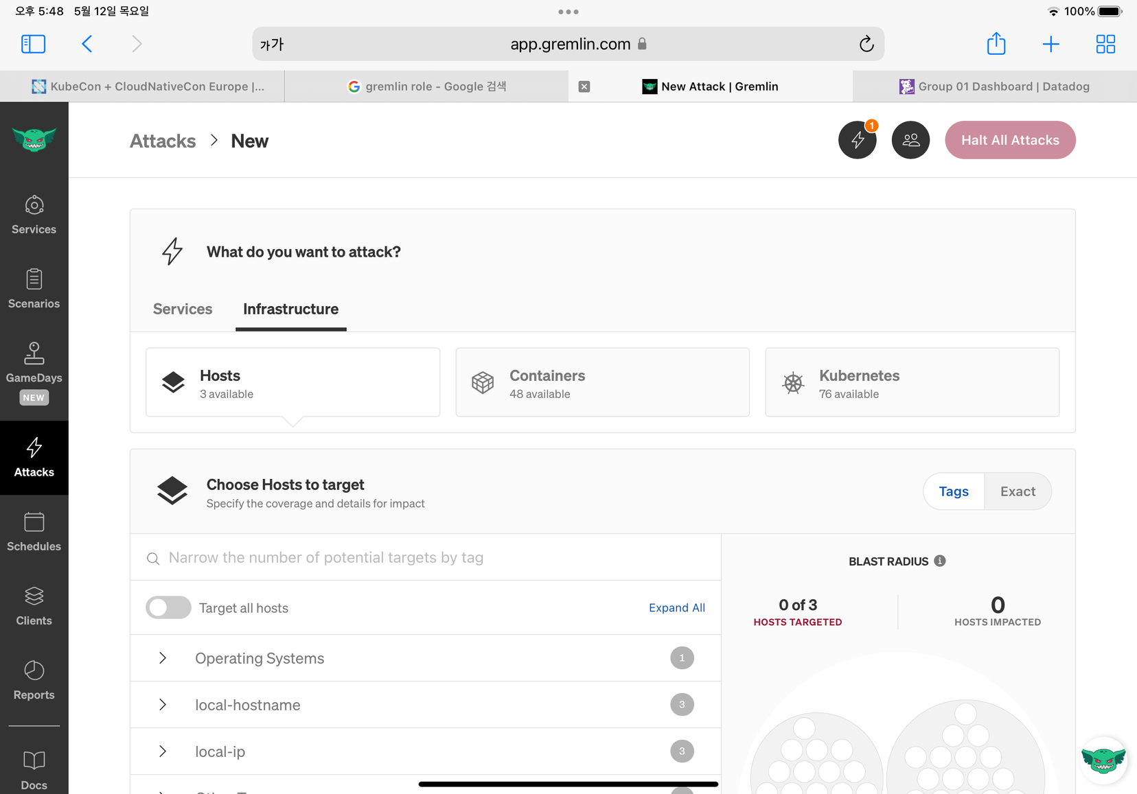 공격대상을 Host / 컨테이너 / 쿠버네티스 단위로 공격대상을 선택할 수 있다.