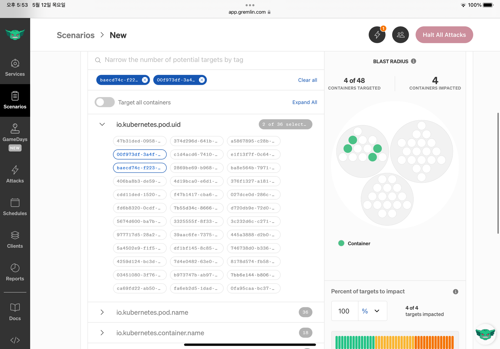 공격 대상을 컨테이너로 선택하면 컨테이너별로 선택이 가능하다.