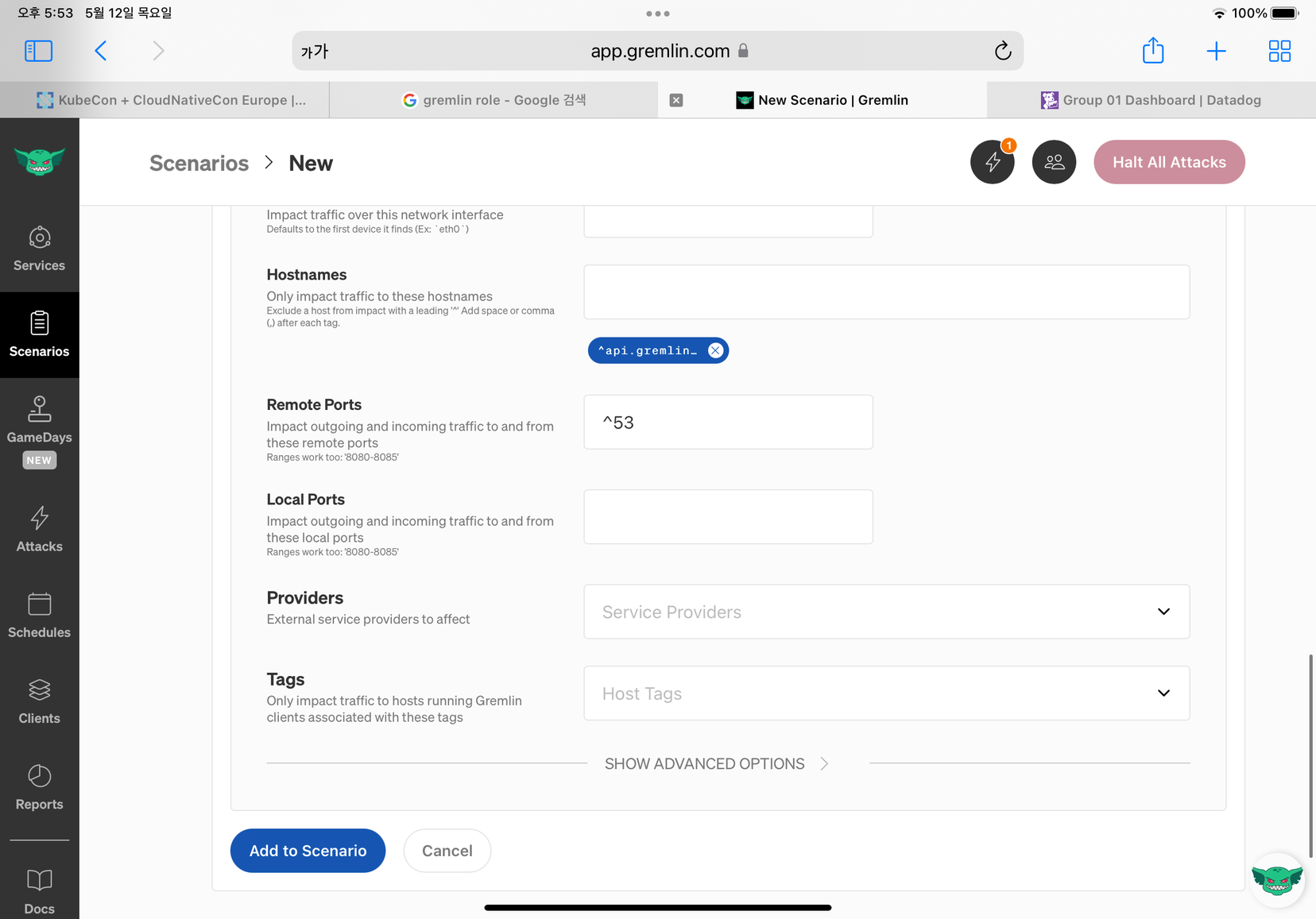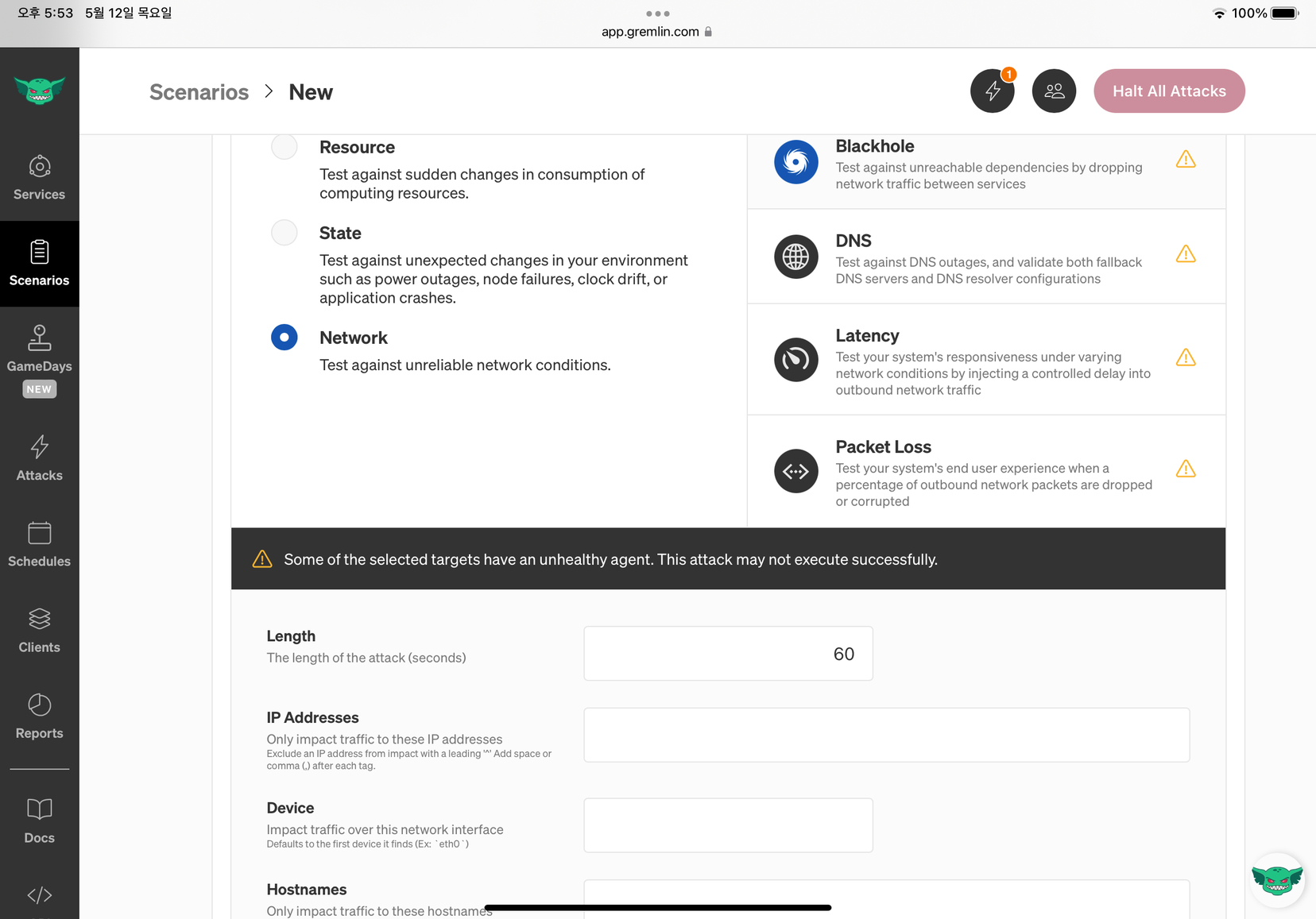 네트워크 공격 중에 예외 할 호스트를 추가할 수 있다. 예) api.gremlin